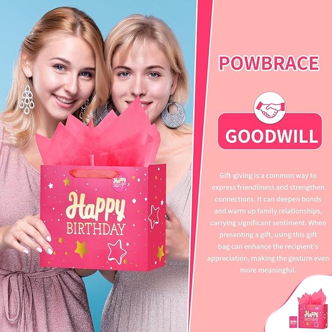 13" Pink Happy Birthday Gift Bag with Tissue Paper and Greeting Card for Party,Happy Birthday Gift Bag for Men Women,Gift Bags Medium size(1 PCS Pink Hot Stamping)