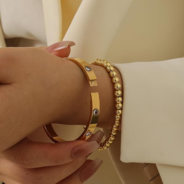 Set of 2: The set includes 1 gold beaded bracelet and 1 gold bracelet, gold beaded bracelets are made of 5mm copper beads and elastic cord. Gold bracelets are made of 316 stainless steel and are plated with 18K gold, making them hypoallergenic and resistant to tarnishing
