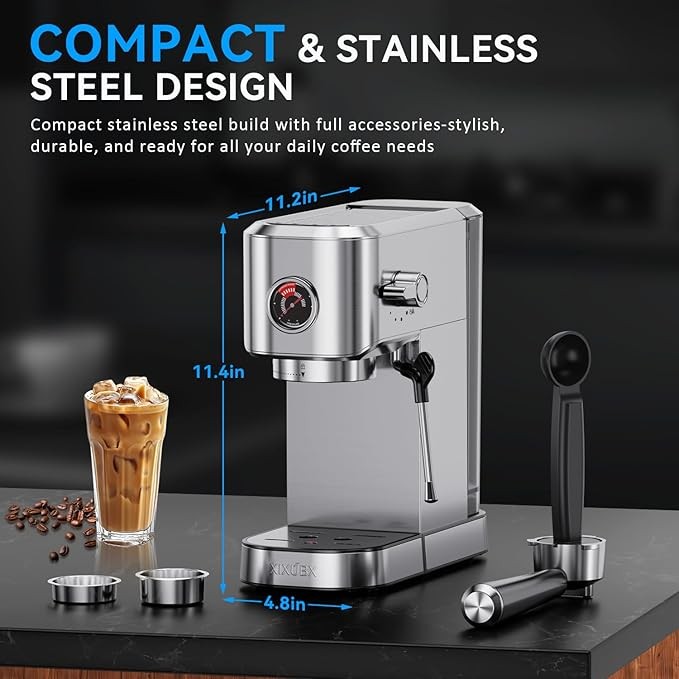Make Your Favorite Espresso Coffee: XIXUBX semi automatic espresso machine is equipped with a powerful steam frother and instant heating system for fast extraction and silky milk foam. The compact and durable stainless steel design saves space and fits in any size kitchen, home or office. You can enjoy latte, cappuccino, macchiato or iced coffee at home
