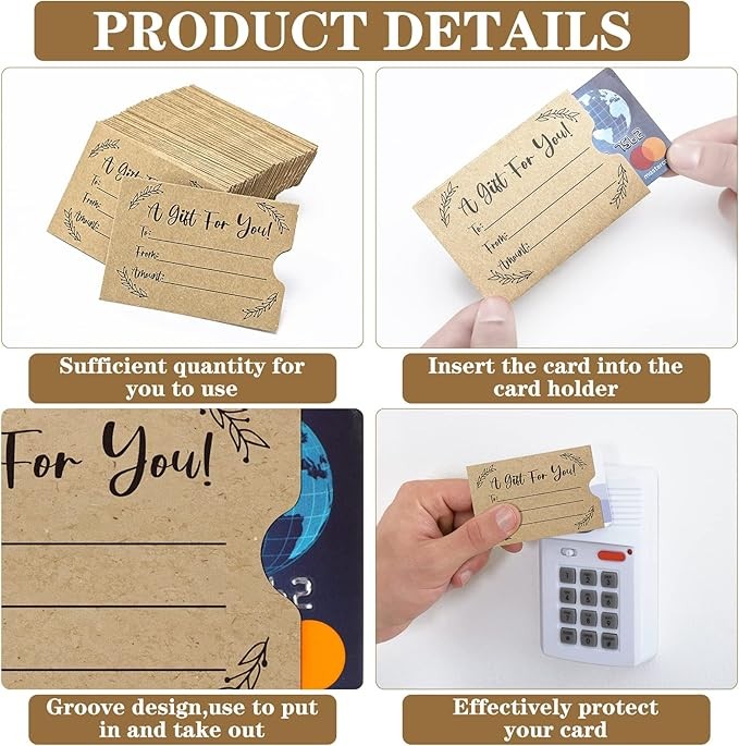Material and Size Details: our gift card sleeves are made of reliable kraft material, safe and trustworthy, with smooth surface and fine workmanship, you can record some information on them; Each is approx. 2.4 x 3.5 inches/ 6 x 9 cm, can hold most cards