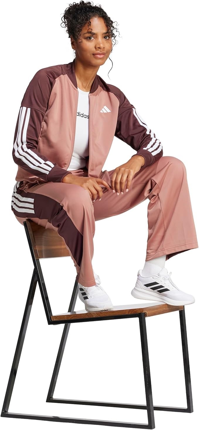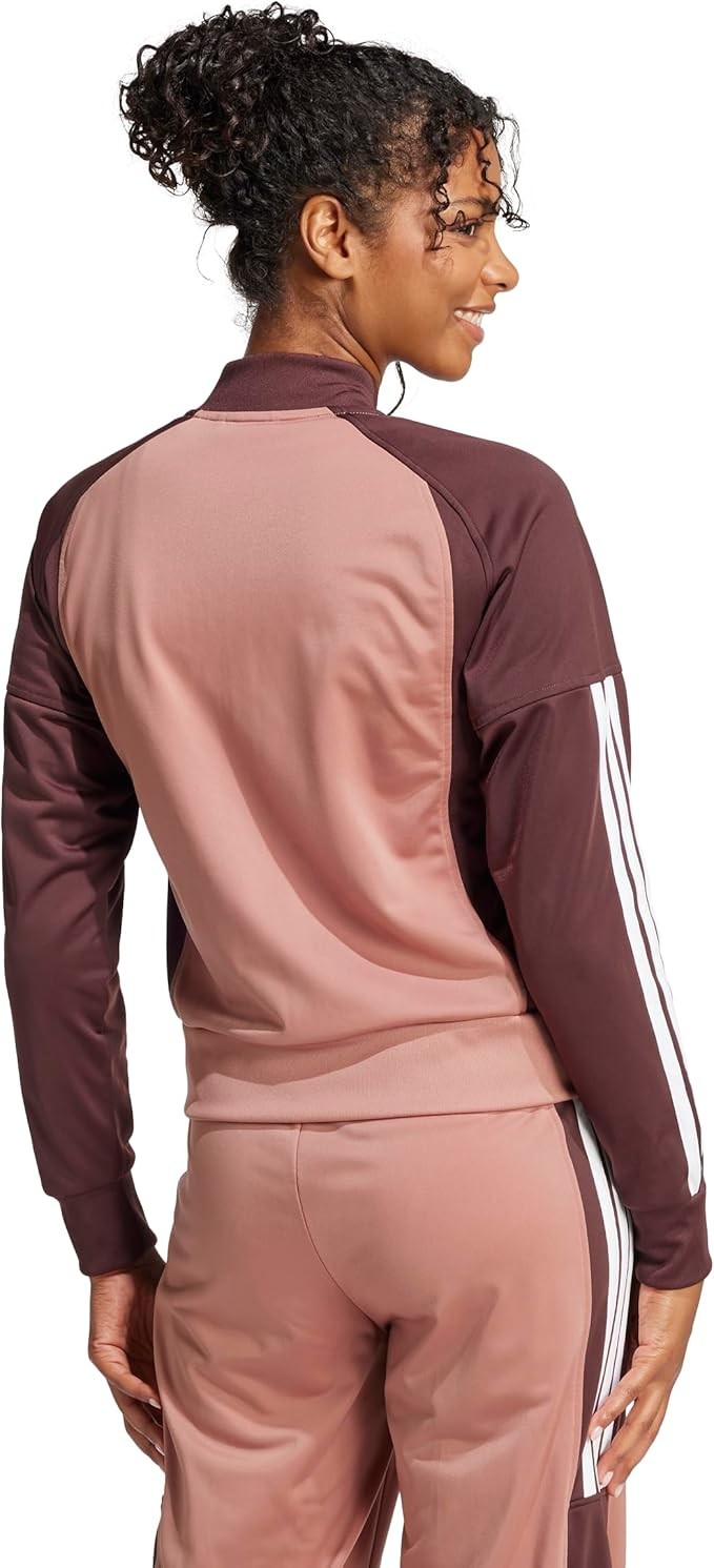 Women's knitted track top in a bomber cut and high-contrast colors.