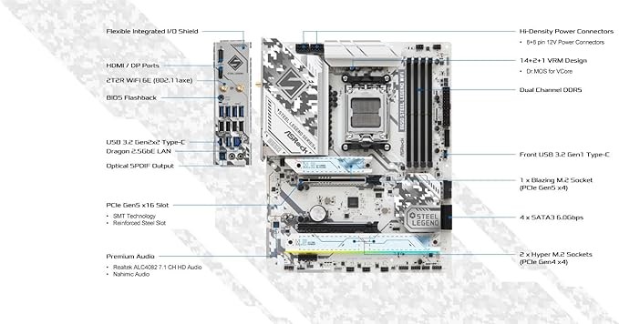 This product supports AMD Ryzen 7000 series processors (AM5). This heavy-duty ATX model features the B650 chipset. It comes with Bluetooth 5.2 and Wi-Fi 6E, offering a variety of wireless features. It uses 20K black capacitors with a lifespan of over 20,000 hours. Dr.MOS design and Vcore ensure smooth CPU power delivery.