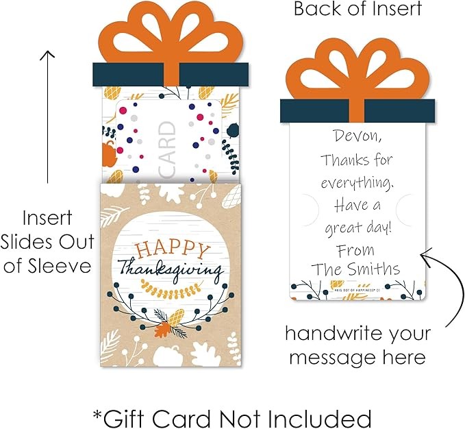 Perfect Fit: Each Happy Thanksgiving Gift Card Holder is approximately 4 inches x 5.5 inches in size and fits a standard 3.5-inch x 2-inch gift card. Simply pull the insert up and out of the card holder sleeve, locate the pre-cut tabs on the insert, and place money or a gift card into the tabs.