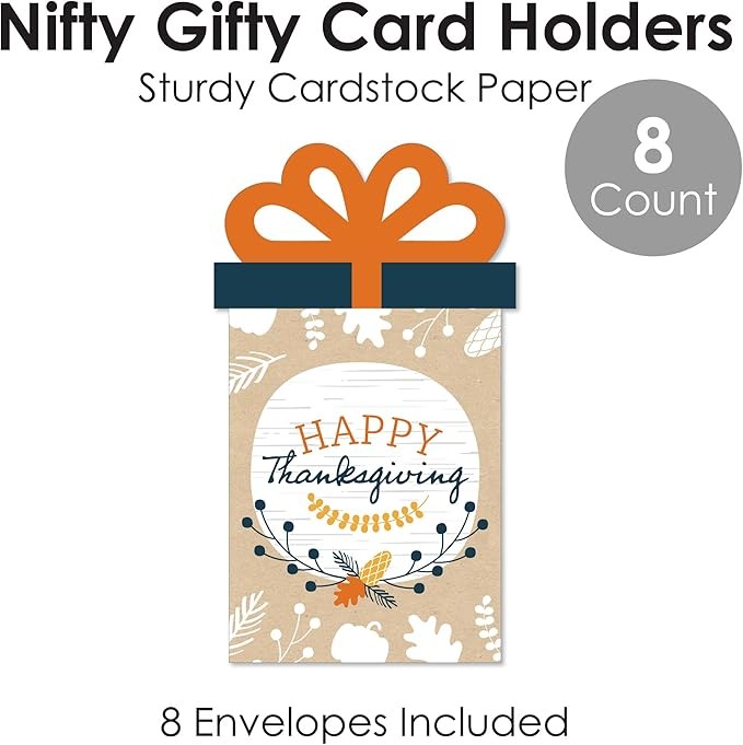 Happy Thanksgiving Nifty Gifty Card Holders Includes 8 professionally printed gift card holders plus 8 premium white envelopes. Each card holder fits a standard gift card or cash.