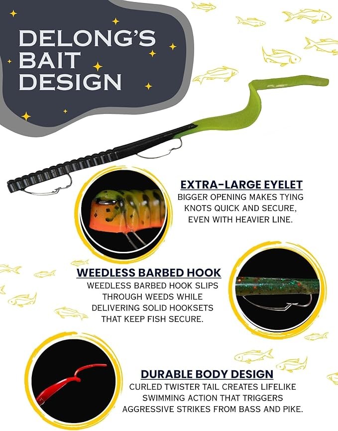 VERSATILE LURES IN YOUR TACKLE BOX: Delong topwater fishing lures and equipment are available in multiple styles. Catch big fish like Largemouth Bass, Smallmouth Bass, Northern Pike, or Striper. Our Black lures, Green Pumpkin lures, Pumpkinseed lures, Catfish lures, FireTiger lures, Red Bug lures, fishing worms make excellent fishing gifts for men and women. Our top water lures are sure to impress them whether you are fishing from a boat or shore.