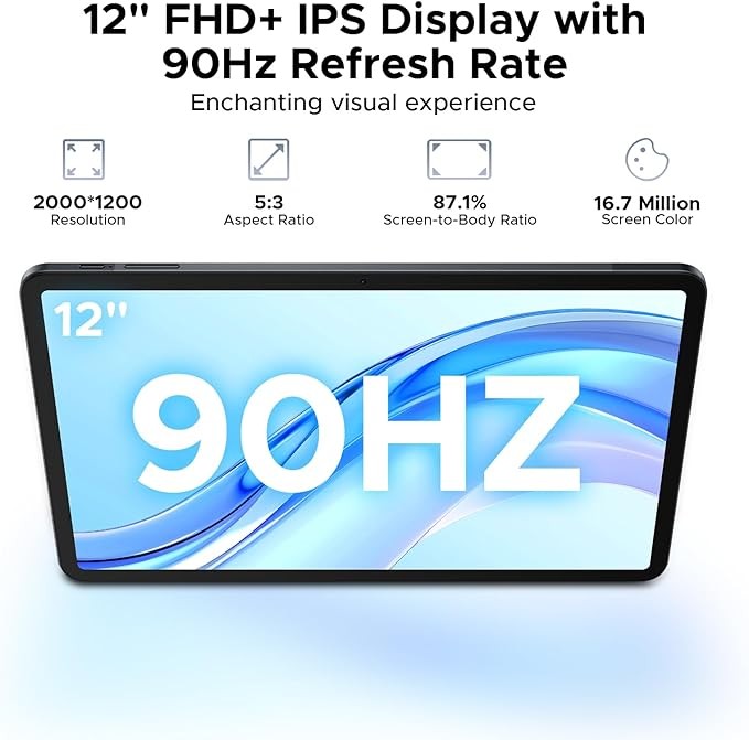 【??" ???+ ???? ???????+?????-???? ??????】Immerse yourself in a cinematic 12-inch FHD+ (2000x1200) IPS display with 87.9% screen-to-body ratio and 90Hz refresh rate.This Android Tablet brings visuals to life with vibrant colors, wide viewing angles, and ultra-smooth scrolling—ideal for movies, design work, and fast-paced games.The 2K resolution ensures razor-sharp text and images,while the 90Hz panel reduces eye strain during long sessions.With a titanium-inspired 7.4mm ultra-slim body,the Tab E3+ Tablet combines portability with an expansive screen.this Android Tablet offers a premium viewing experience rivaling far costlier devices.