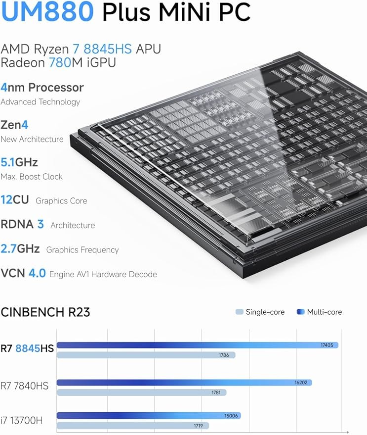 【Ryzen 7 8845HS Processor】MINISFORUM UM880 Plus Mini PC is equipped with AMD Ryzen 7 8845HS processor, ultra-thin processor manufactured using 4nm process, 8 cores 16 threads, the standard clock speed is 3.8GHz, and the max. boost clock up to 5.1 GHz.