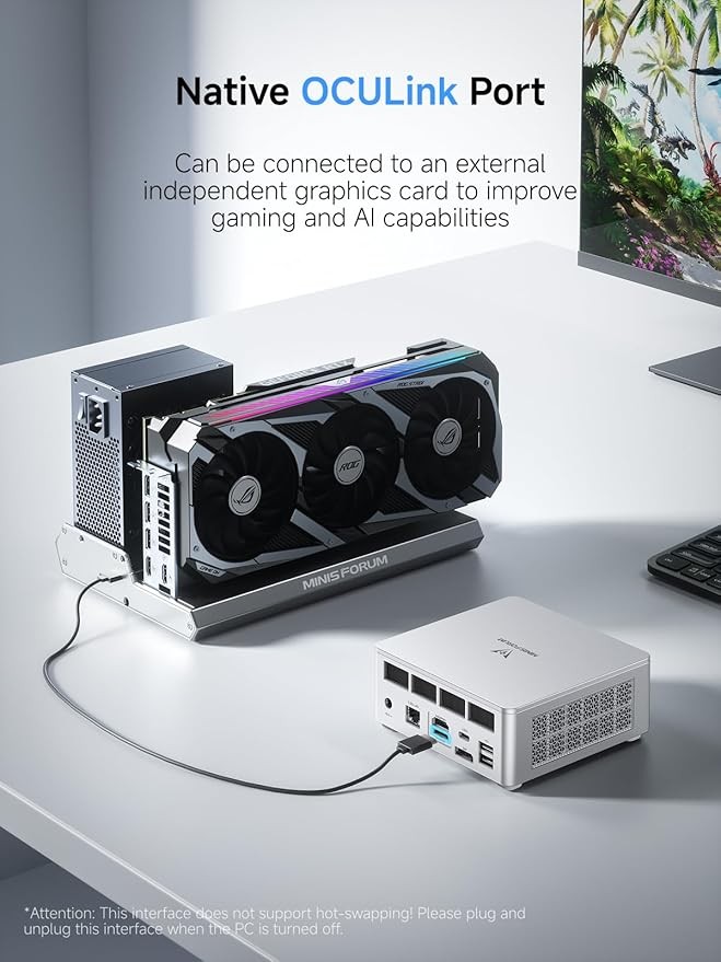 【Support OCulink Port】Our newly upgraded UM880 Plus is equipped with a native OCulink interface. OCuLink is a standard for externally connecting PCI Express, the speed is PCIe4.0 x4=64G. With this port, you can connect to an external discrete graphics card to enhance gaming and AI capabilities, supporting faster speeds compared to Thunderbolt 4 and USB4. Note: This interface does not support hot-swapping. Please plug and unplug it when the PC is turned off. In addition, OCulink requires one M.2 2280 PCIe4.0 SSD slot.