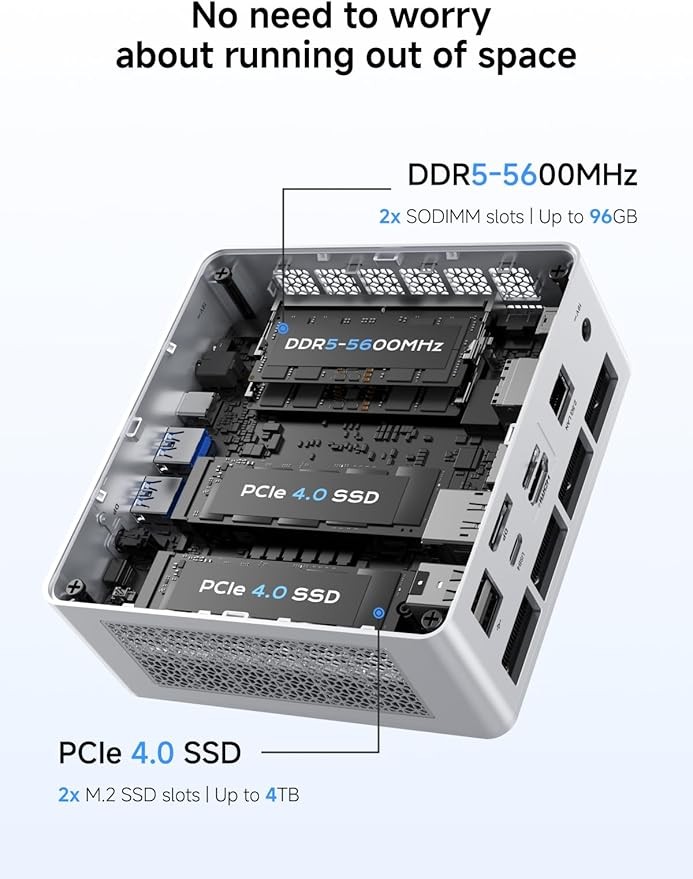 【Large Capacity】UM880 Plus Small PC has been pre-installed with 32GB (16GB*2) DDR5 RAM (up to 96GB) + 1TB M.2 2280 PCIe 4.0 SSD (up to 4TB), but you could expand the SSD to 4TB by yourself to enjoy the fun of DIY. There is another M.2 2280 PCIe4.0 SSD slot(up to 4TB), you can customize it as you like without worrying about capacity, watch and store large-scale movies, and photos without stress.