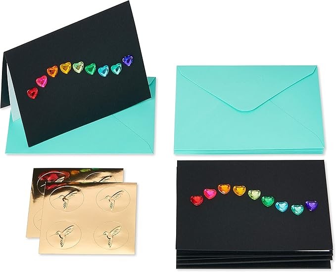 Papyrus blank greetings/cards feature shiny, heart-shaped gem attachments in a rainbow of colors on a bold black background.