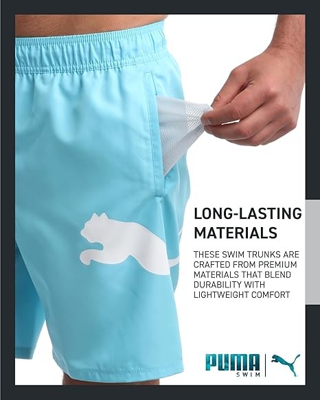 Quick Dry Performance: Dive into aquatic escapades with unwavering confidence in these meticulously crafted PUMA Men's Bathing Suit Trunks; Engineered with state-of-the-art quick-dry technology, these trunks ensure rapid moisture evaporation, guaranteeing you remain comfortably dry both in and out of the water; Bid farewell to the discomfort of soggy swimwear and revel in the freedom to enjoy every moment of your aquatic adventures without hesitation