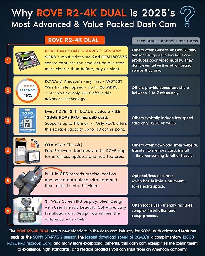Car Camera with GPS – Both the new front and rear dash cams feature built-in GPS, allowing you to view real-time vehicle speed and a compass on the 3-inch IPS widescreen camera. It records your precise driving route, location, and speed limit signs directly in the video. You can easily view dashcam videos with GPS data on your PC or Mac using ROVE's free GPS Player and access additional evidence when needed.