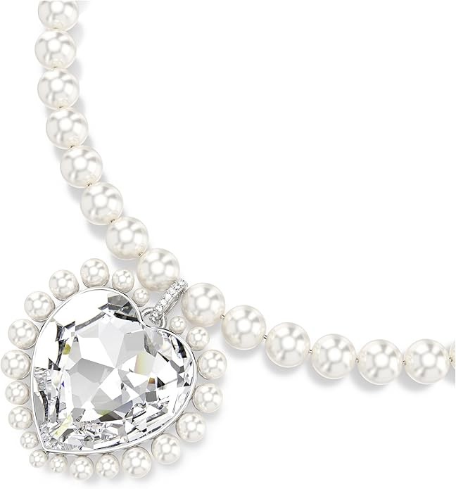 The rhodium plated design uses Swarovski Crystal Pearls to maximum effect, placing them around the necklace itself, and also in different sizes around the central heart-shaped crystal